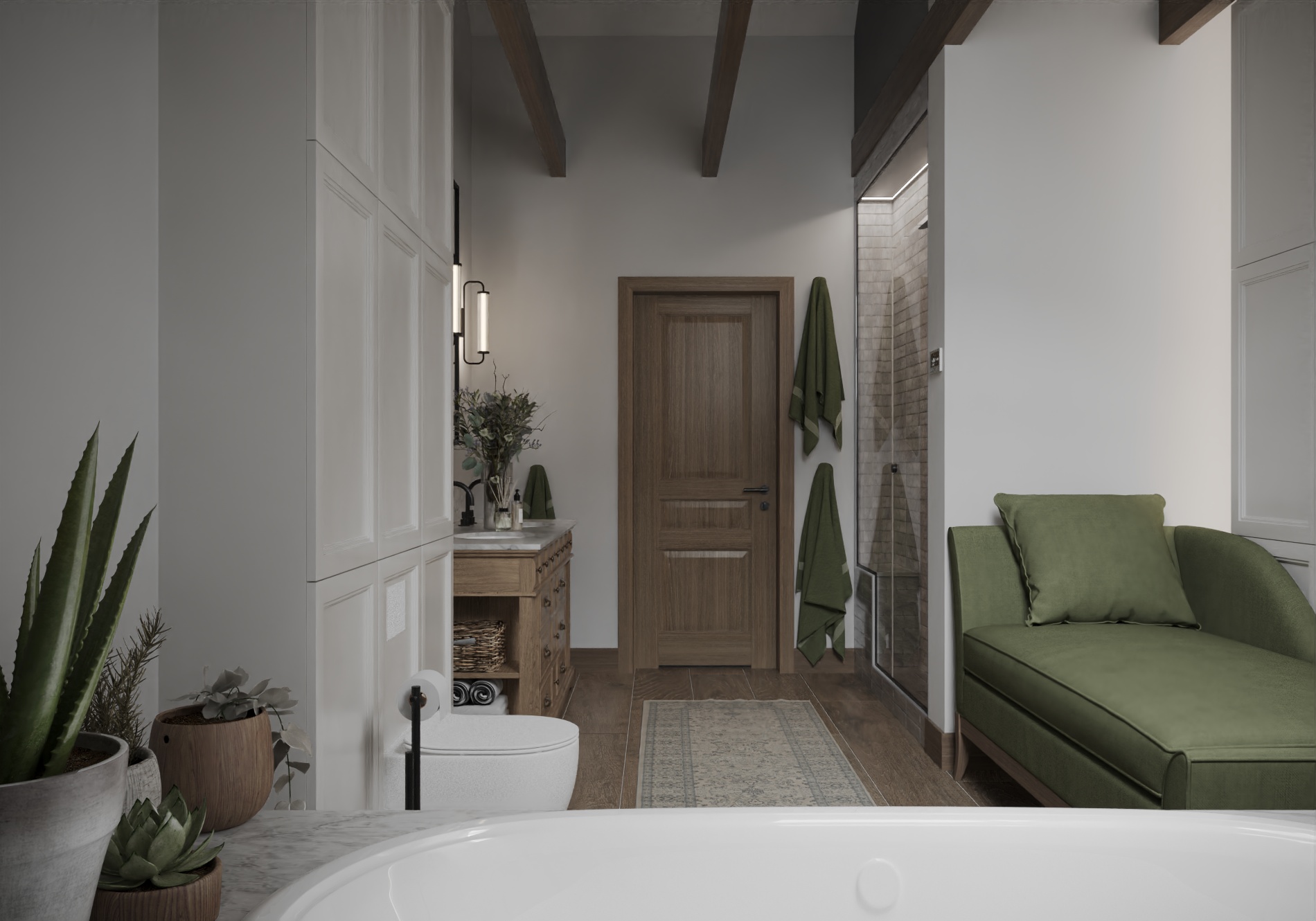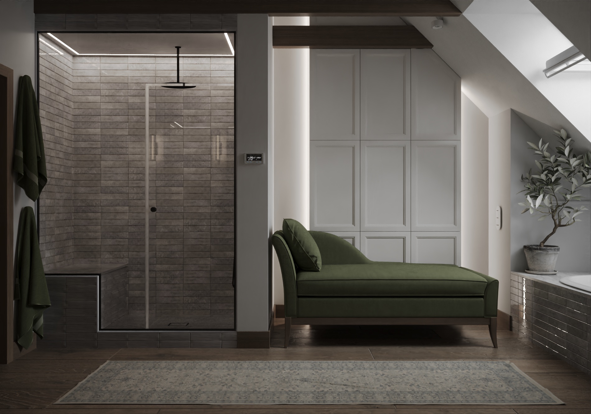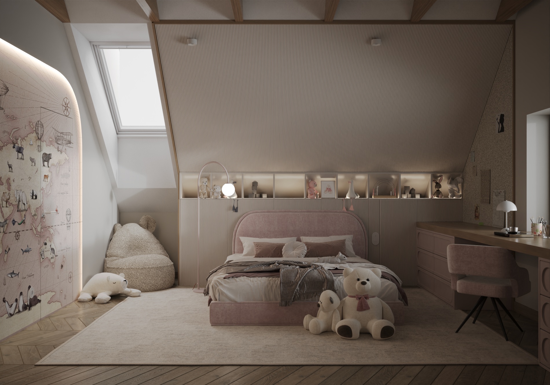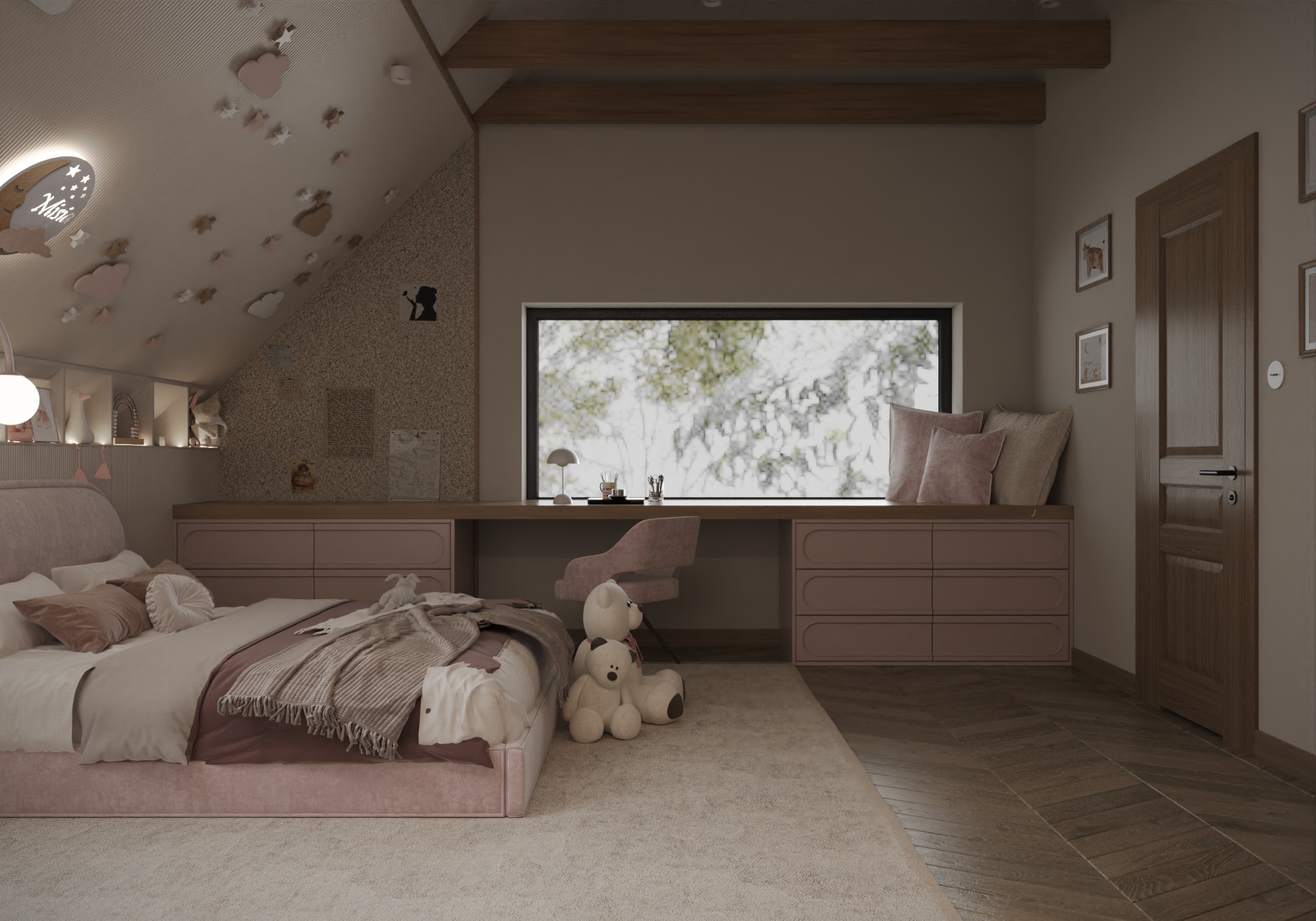 Wnętrze łączy nowoczesne rozwiązania projektowe z ciepłą, wyważoną paletą materiałów. Naturalne światło, spokojne proporcje oraz konsekwentnie prowadzone detale budują atmosferę harmonii i ponadczasowej elegancji. Projekt został zaplanowany tak, aby mógł elastycznie reagować na zmieniające się potrzeby mieszkańców, zachowując przy tym estetyczną spójność i funkcjonalność na lata.