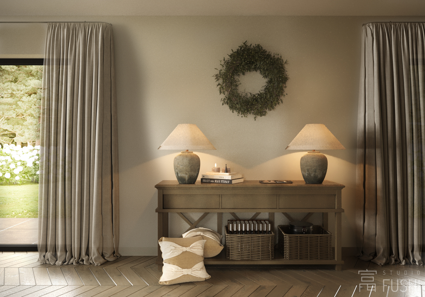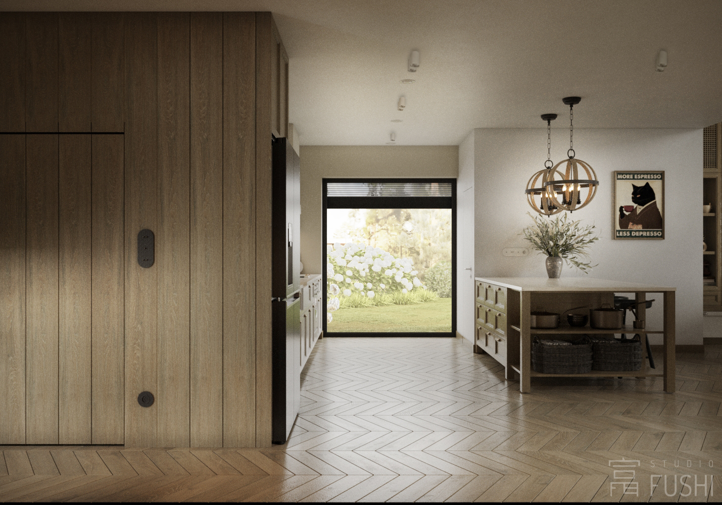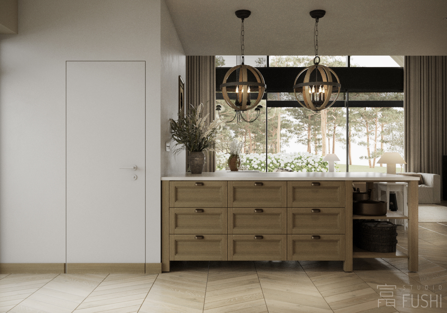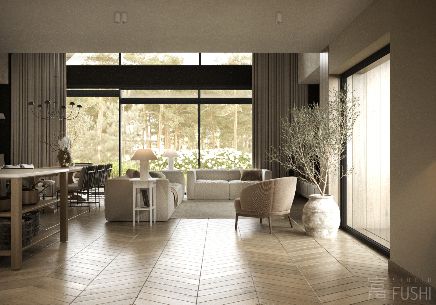 Projekt wnętrz domu jednorodzinnego w Małocicach został zaprojektowany jako spójna, funkcjonalna całość, podporządkowana codziennemu rytmowi życia domowników oraz relacji wnętrza z otaczającym krajobrazem. Przestrzeń opiera się na czytelnym układzie funkcjonalnym, w którym strefy dzienne i prywatne płynnie się przenikają, zapewniając komfort użytkowania i naturalną logikę poruszania się po domu.