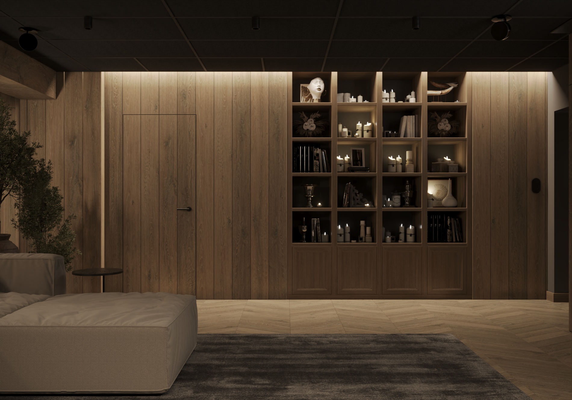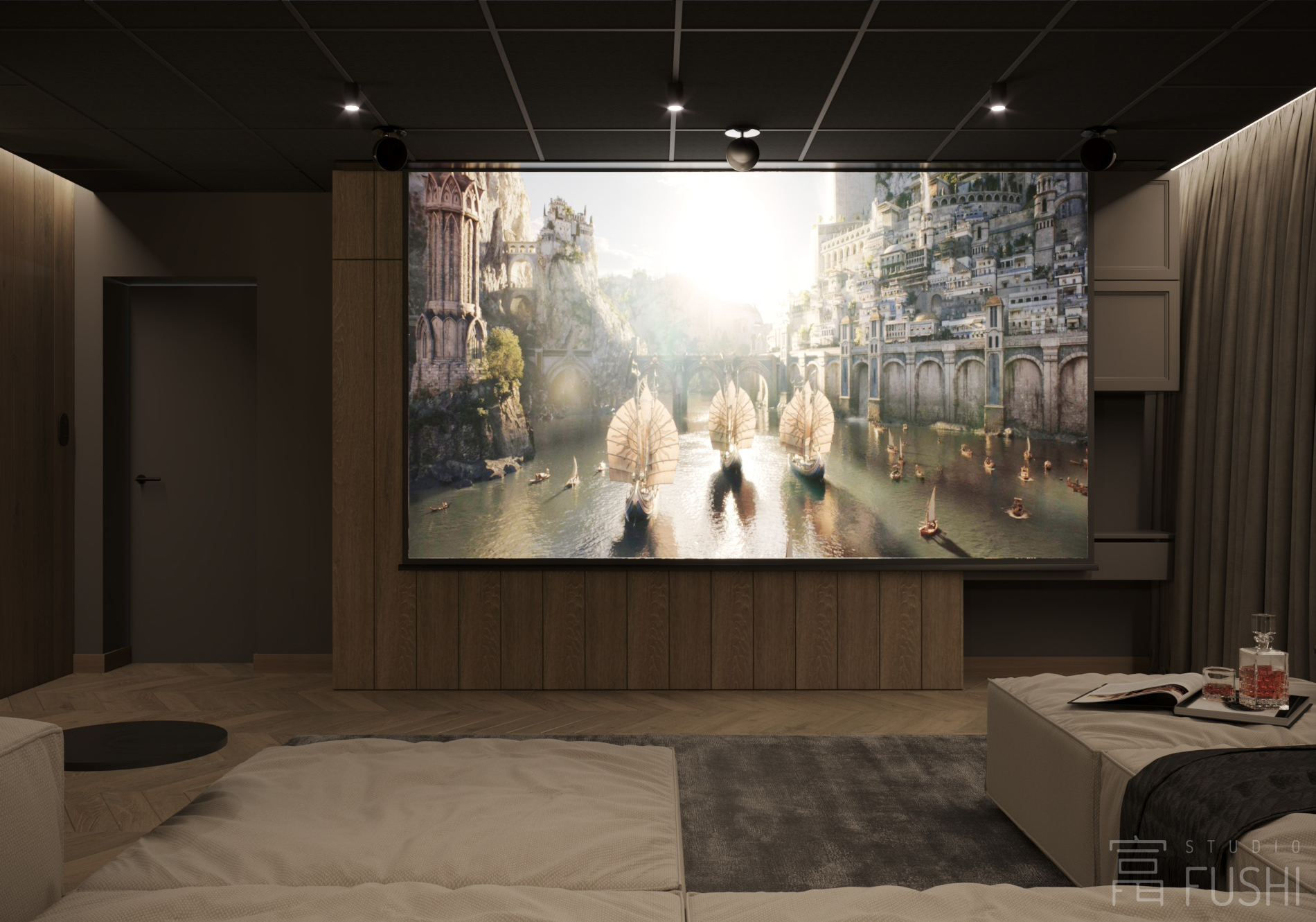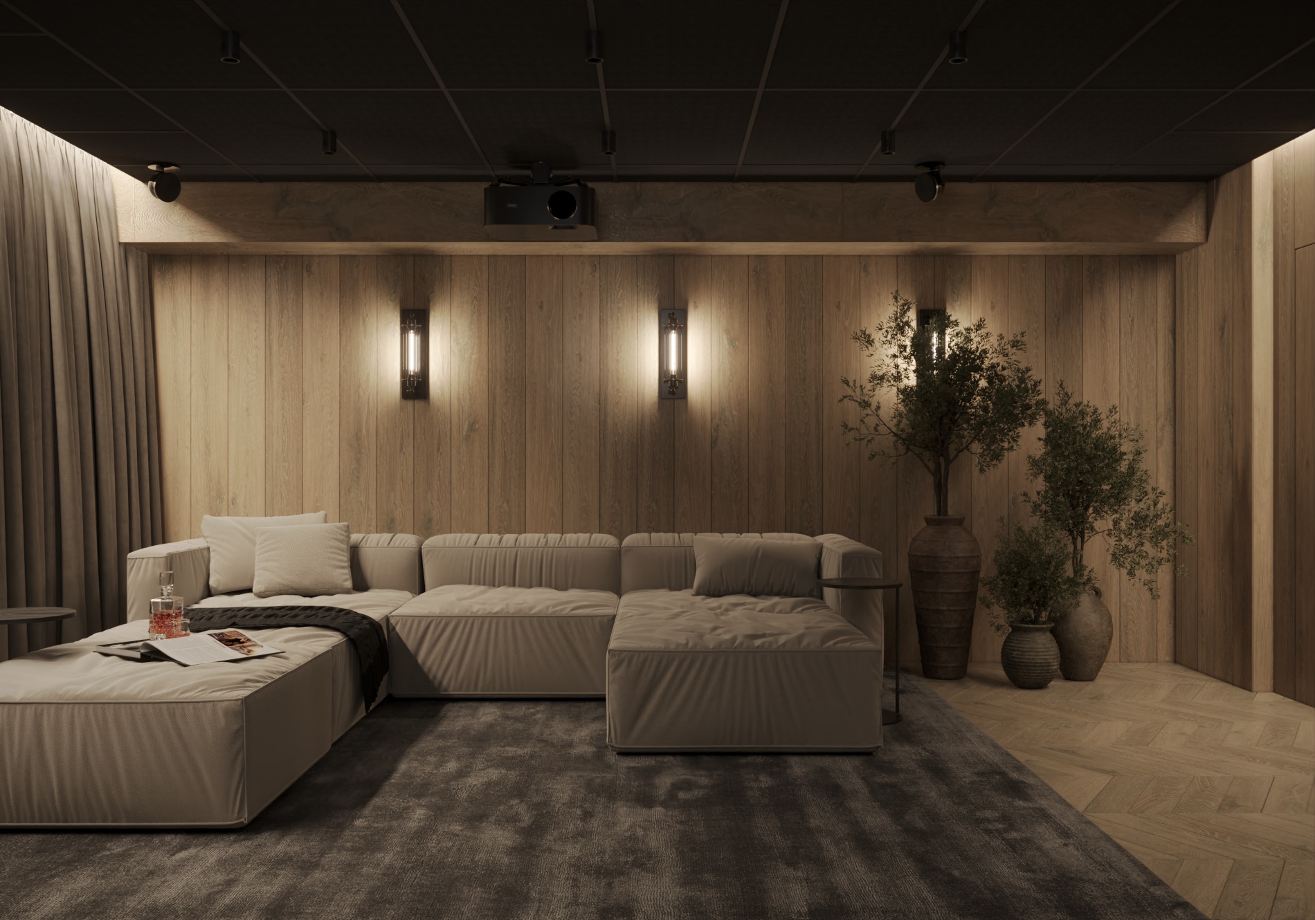 Całość dopełnia niezależna strefa relaksu w postaci sali kinowej — przestrzeni zaprojektowanej z myślą o wyciszeniu i komforcie, funkcjonującej autonomicznie względem pozostałych części domu. Projekt wnętrz w Małocicach to przykład świadomego podejścia do architektury wnętrz, w którym estetyka, ergonomia i jakość codziennego życia tworzą jedną, przemyślaną całość.