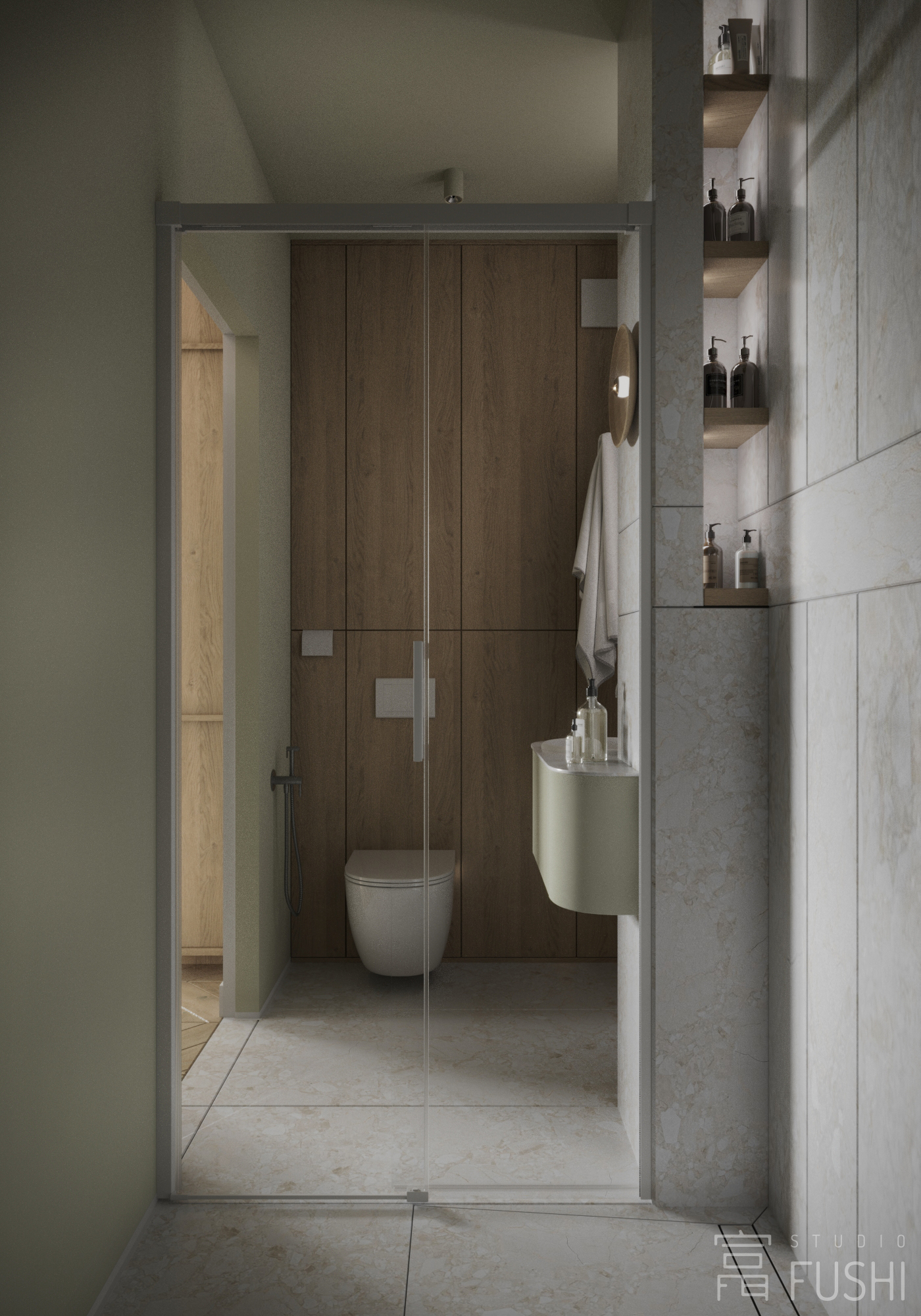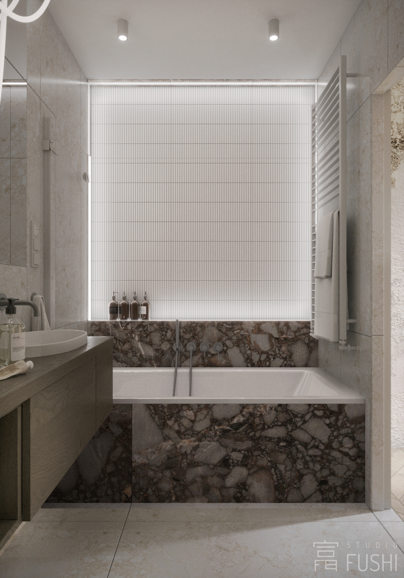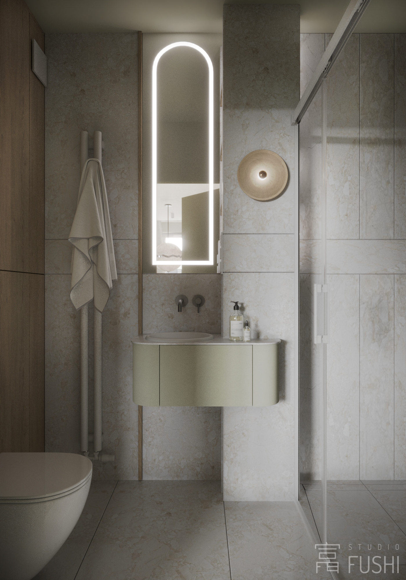 Część prywatna mieszkania utrzymana jest w tej samej, spójnej estetyce. Minimalistyczne formy, ograniczona liczba materiałów oraz precyzyjnie zaplanowane detale pozwalają skupić się na jakości przestrzeni, a nie na dekoracyjności. Całość tworzy wnętrze ponadczasowe — neutralne, ale wyraziste w swojej prostocie.