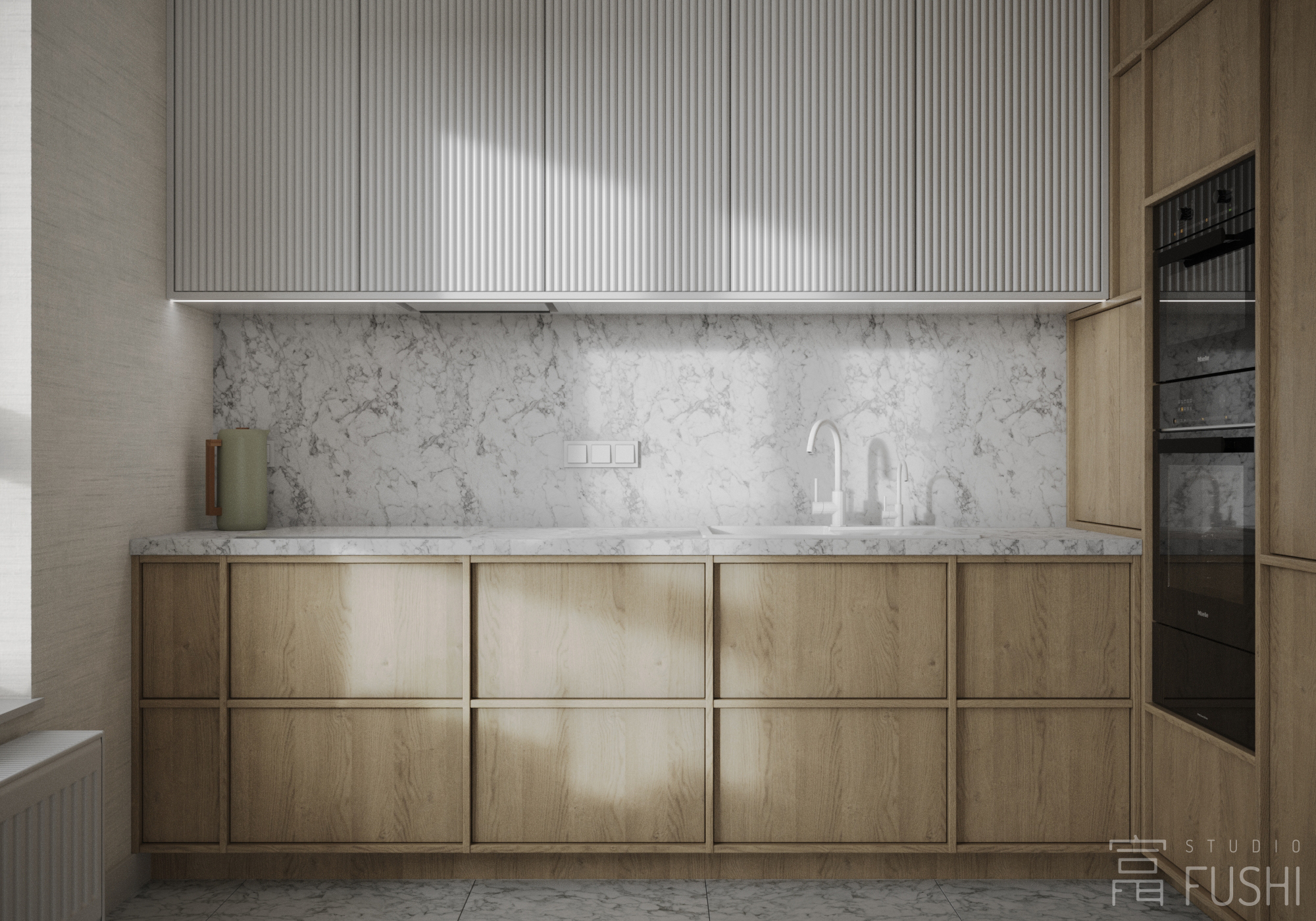 Strefa dzienna została zaprojektowana jako otwarta, ale wyraźnie zdefiniowana — kuchnia, jadalnia i salon przenikają się płynnie, zachowując funkcjonalną niezależność. Zabudowy meblowe pełnią rolę elementów architektonicznych: porządkują proporcje wnętrza i wprowadzają rytm bez wizualnego ciężaru.