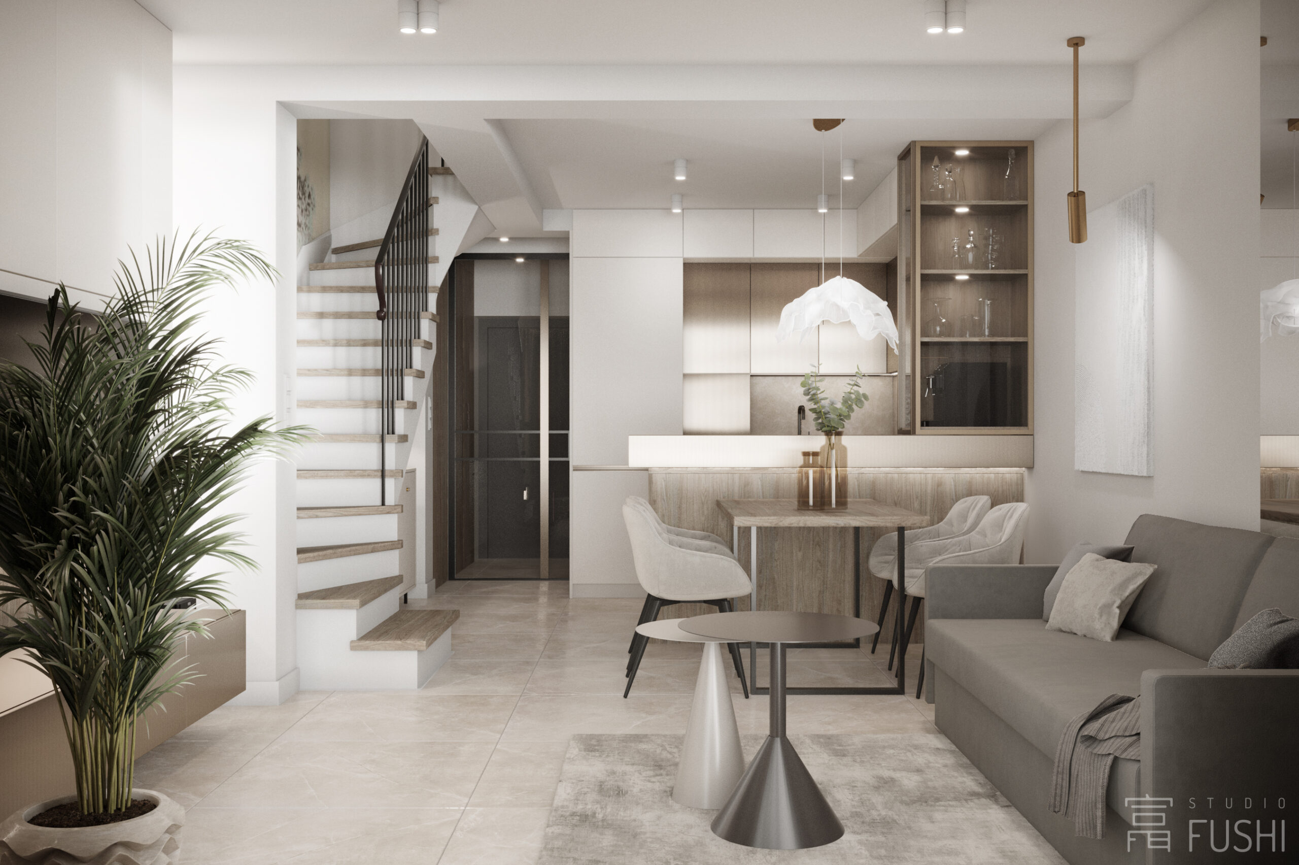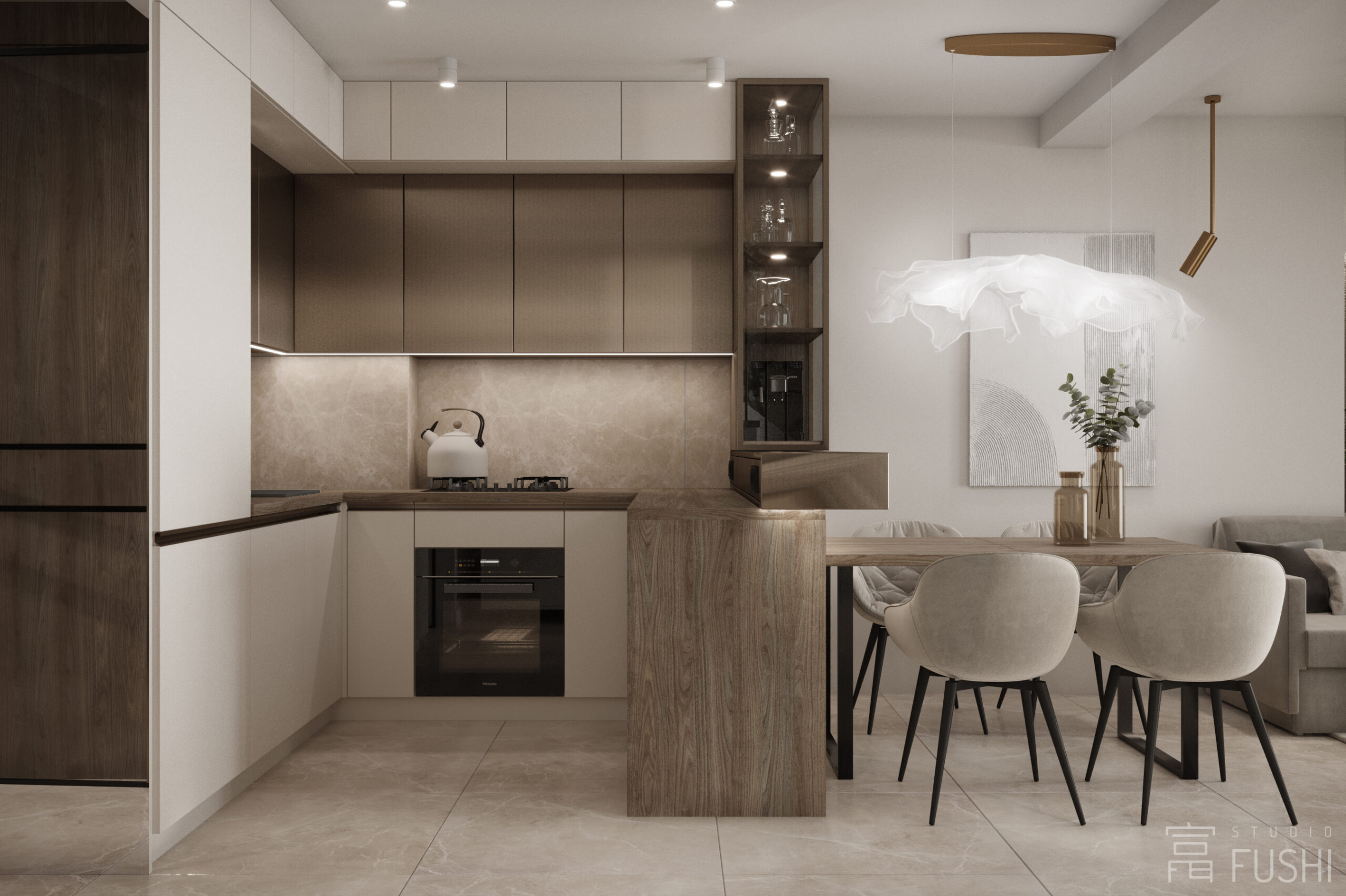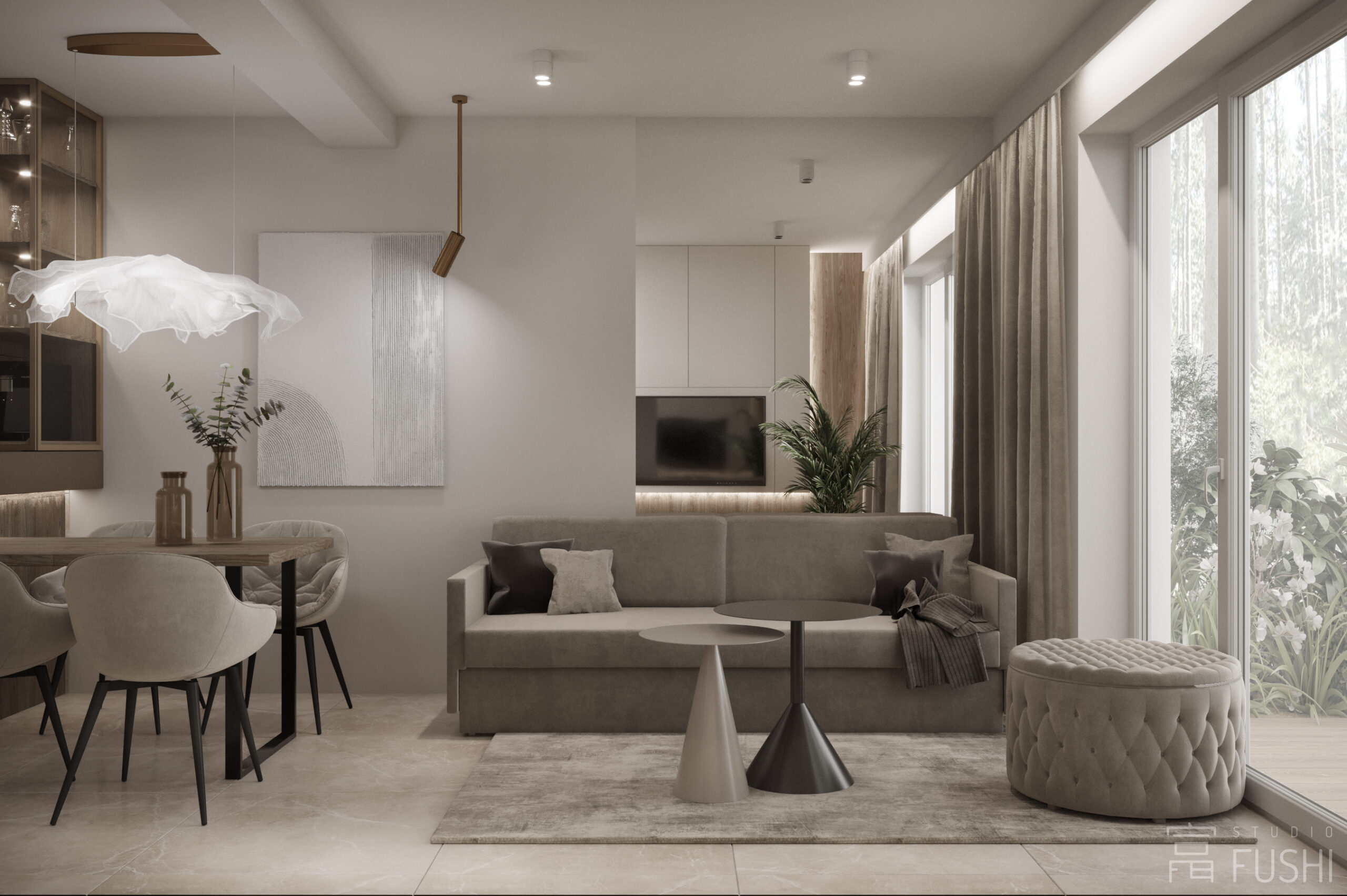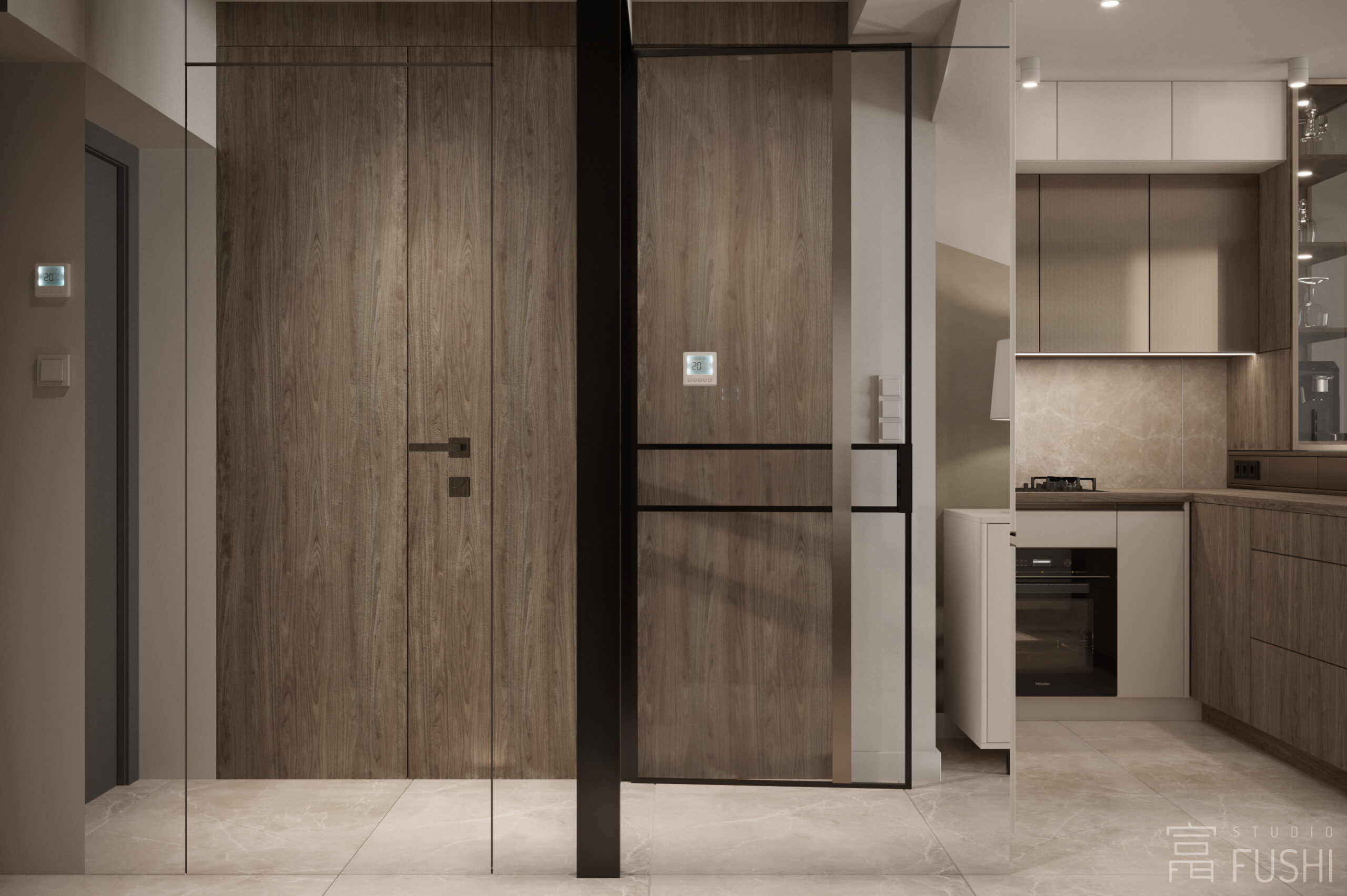 Wnętrze segmentu w warszawskim Rembertowie zostało zaprojektowane jako harmonijne połączenie stonowanej elegancji i precyzyjnie dopracowanej funkcji. Jasna paleta drewna, taupe i bieli została przełamana czernią oraz subtelnymi akcentami złota, nadając przestrzeni wyrazisty, ale spokojny charakter.