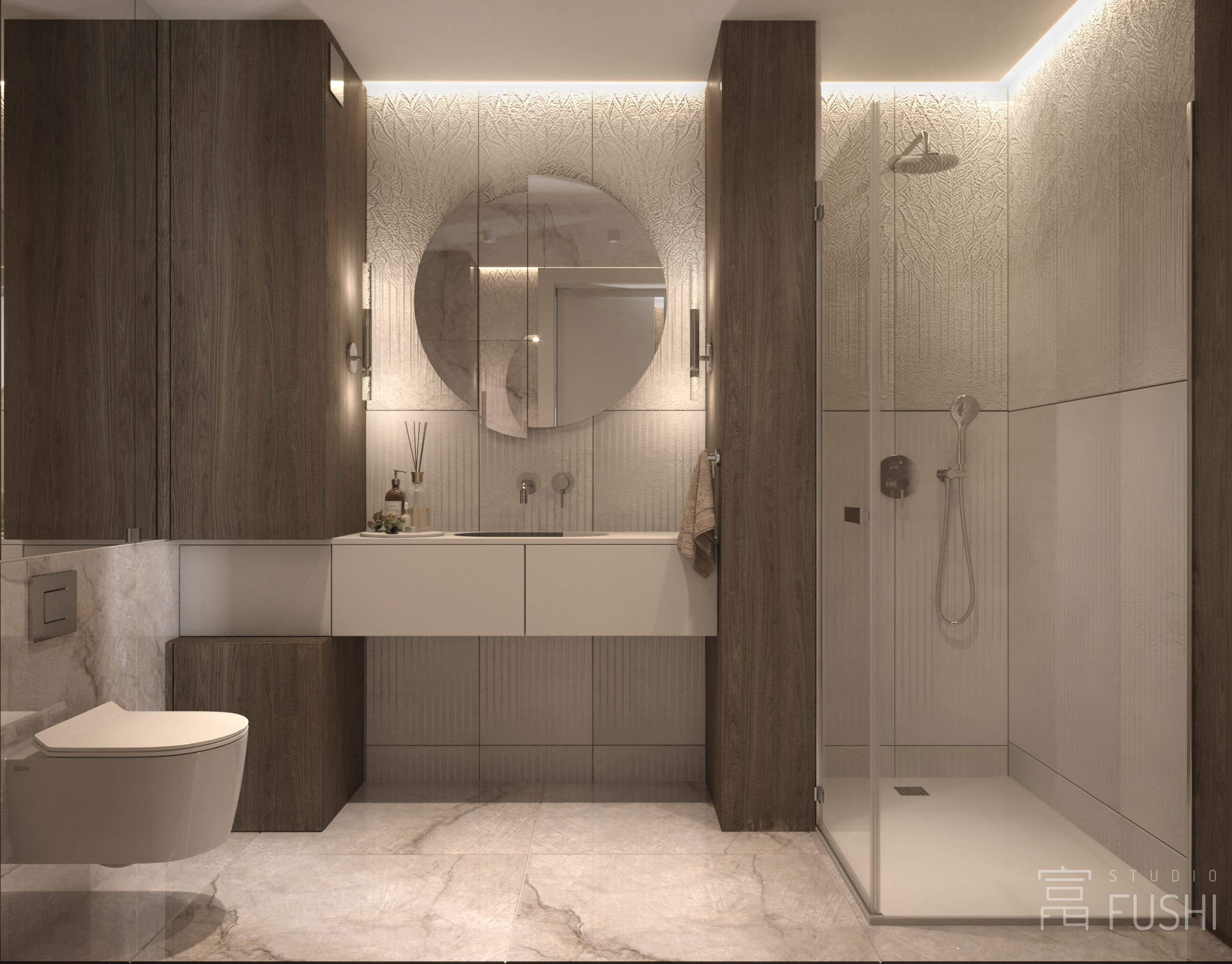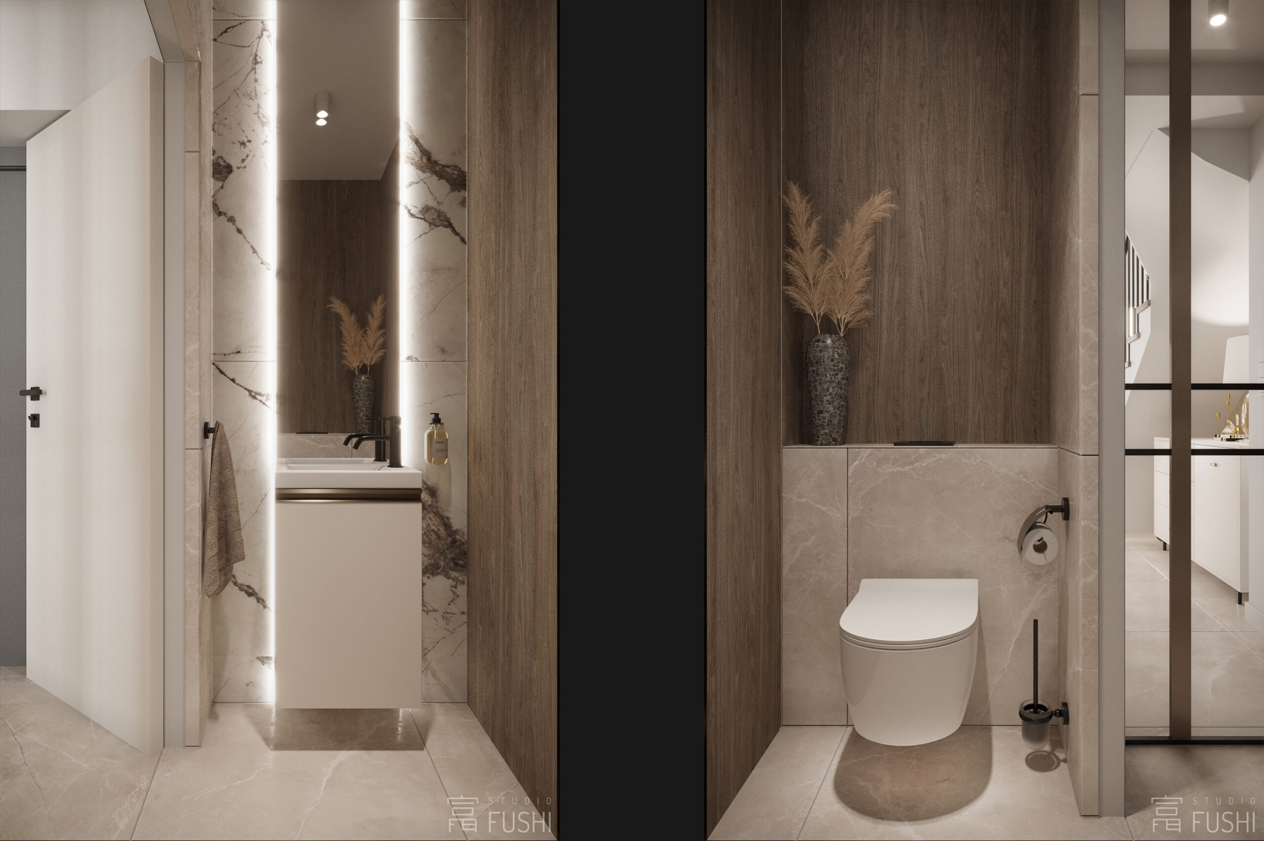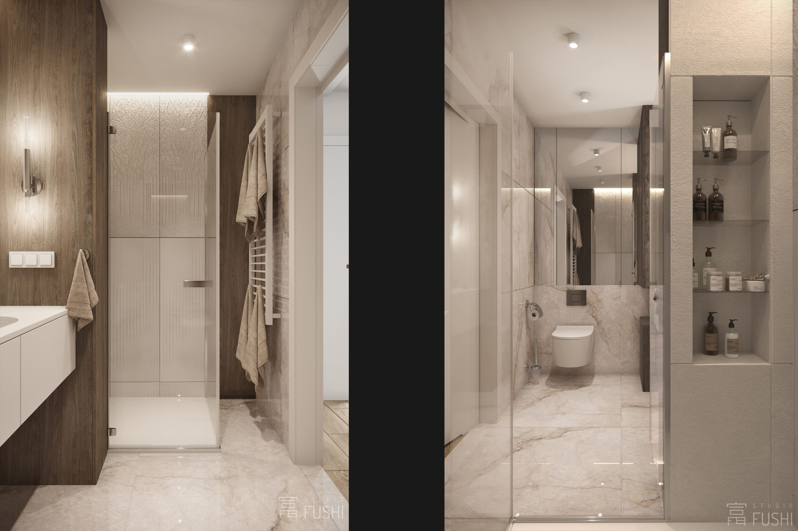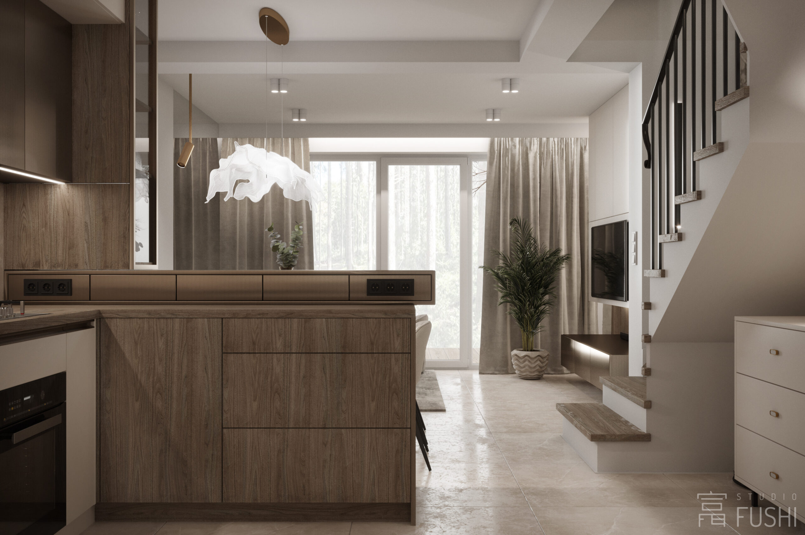 Wnętrze segmentu w warszawskim Rembertowie zostało zaprojektowane jako harmonijne połączenie stonowanej elegancji i precyzyjnie dopracowanej funkcji. Jasna paleta drewna, taupe i bieli została przełamana czernią oraz subtelnymi akcentami złota, nadając przestrzeni wyrazisty, ale spokojny charakter.
