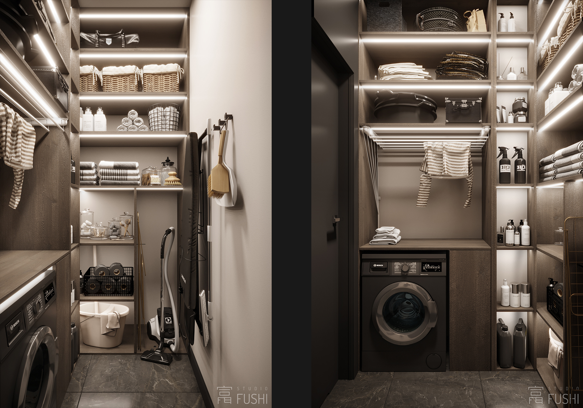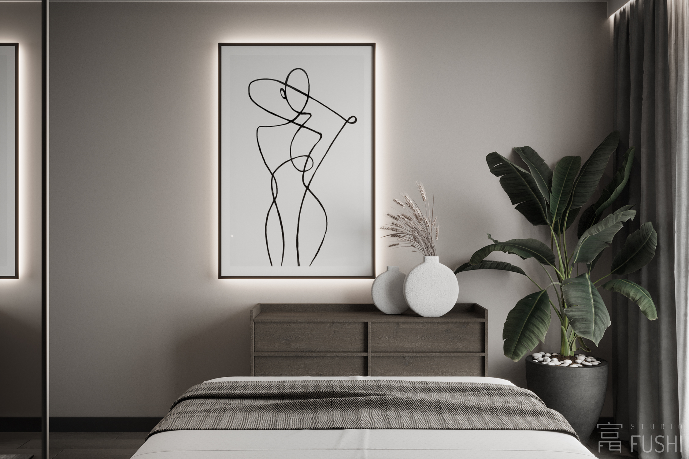 Część prywatna utrzymana jest w tej samej, spokojnej stylistyce. Ograniczona liczba materiałów, dopracowane detale oraz wyważone proporcje tworzą wnętrze neutralne i ponadczasowe, zaprojektowane tak, aby dobrze funkcjonowało zarówno dziś, jak i w perspektywie kolejnych lat.
