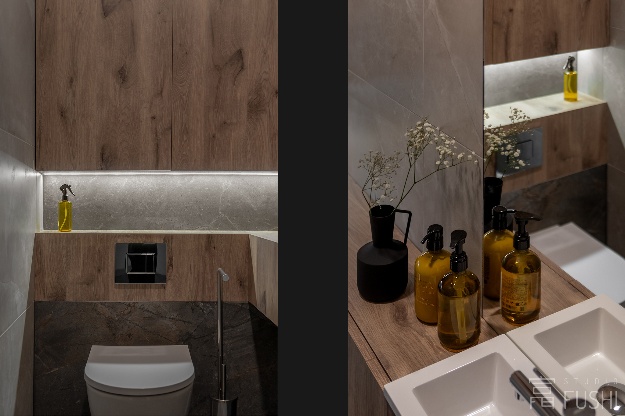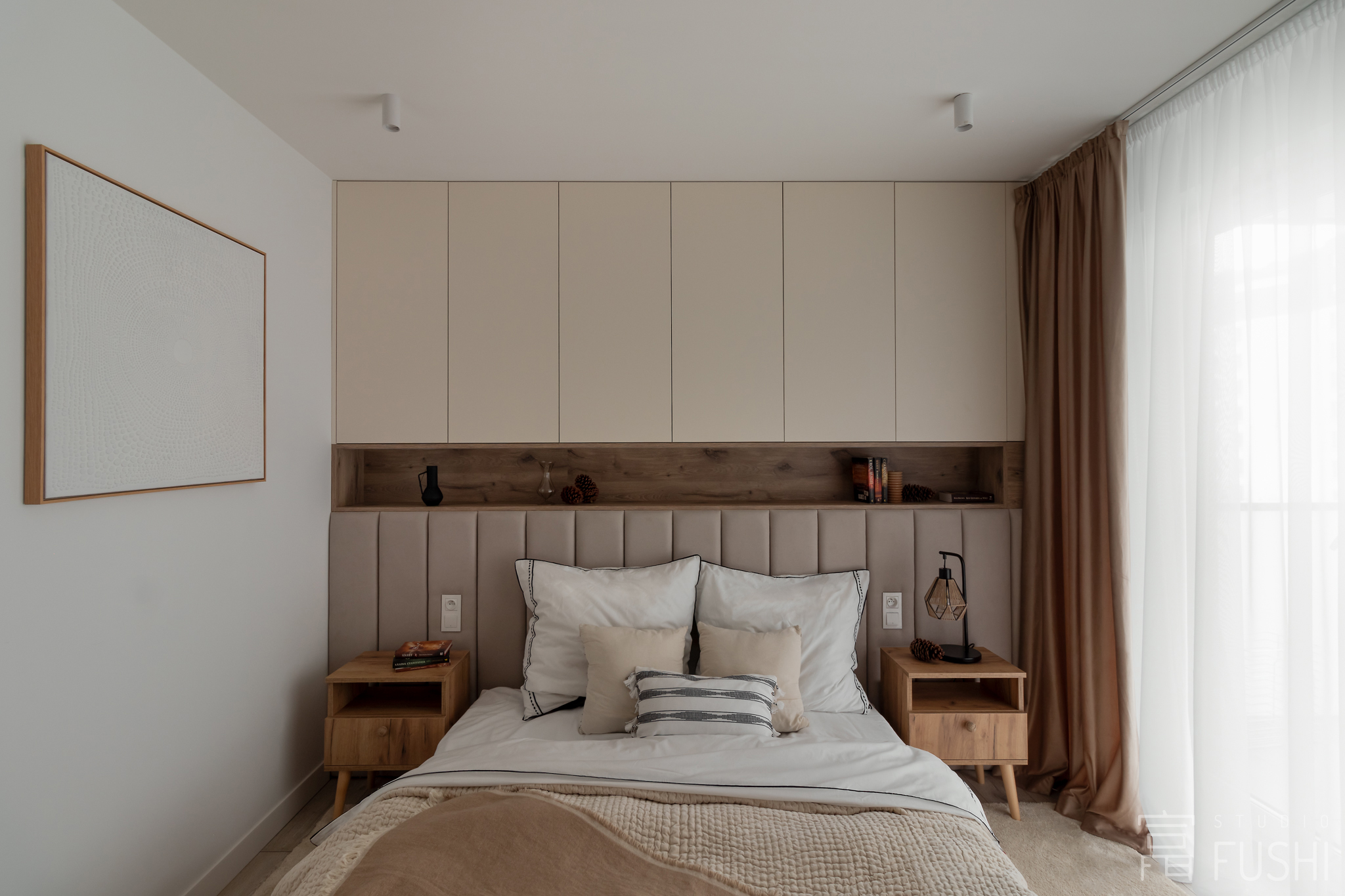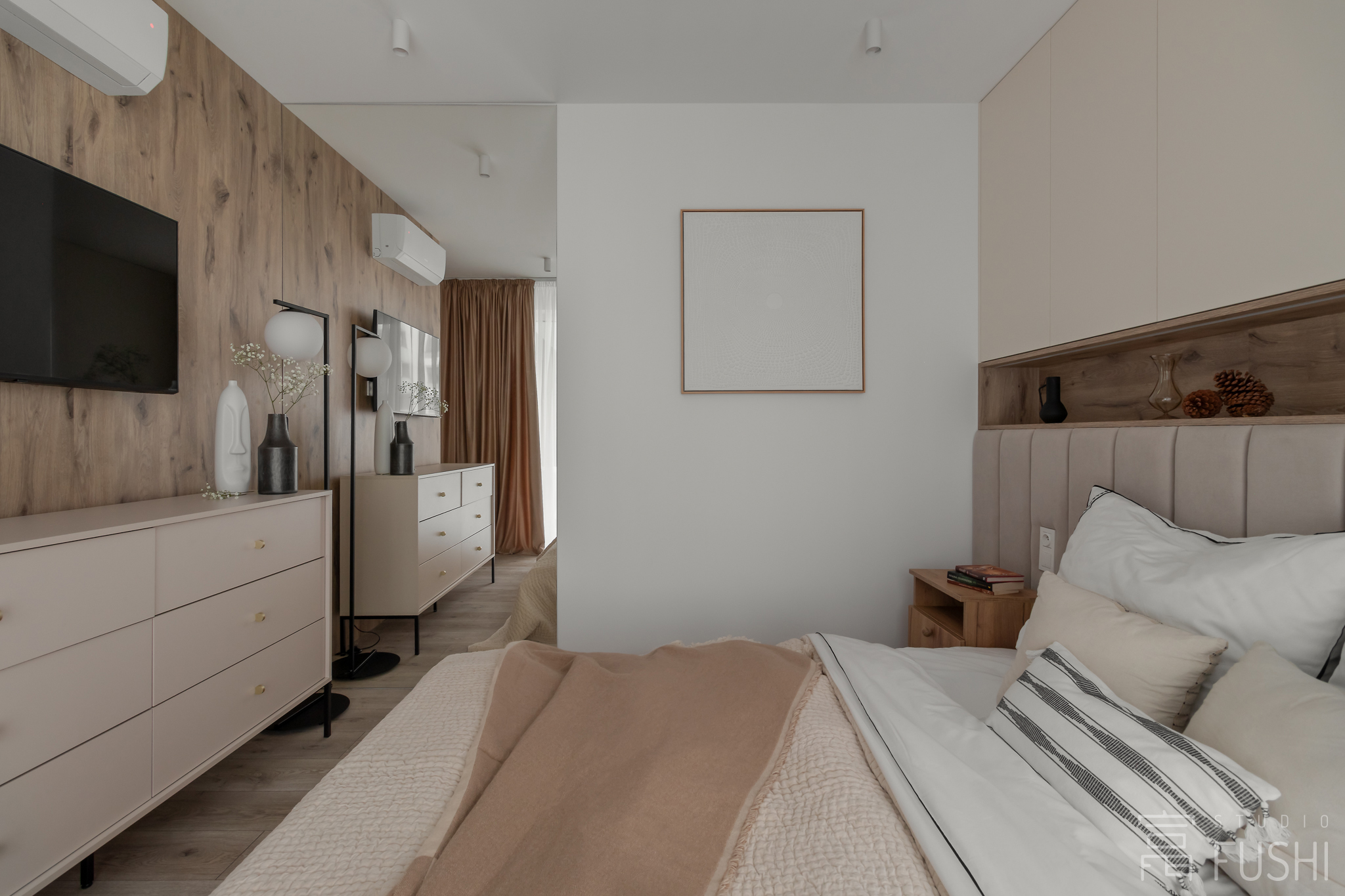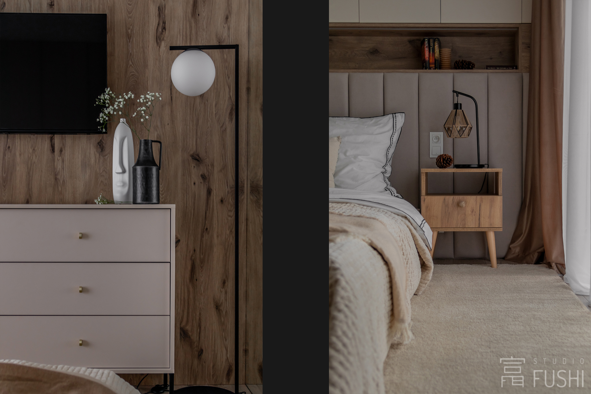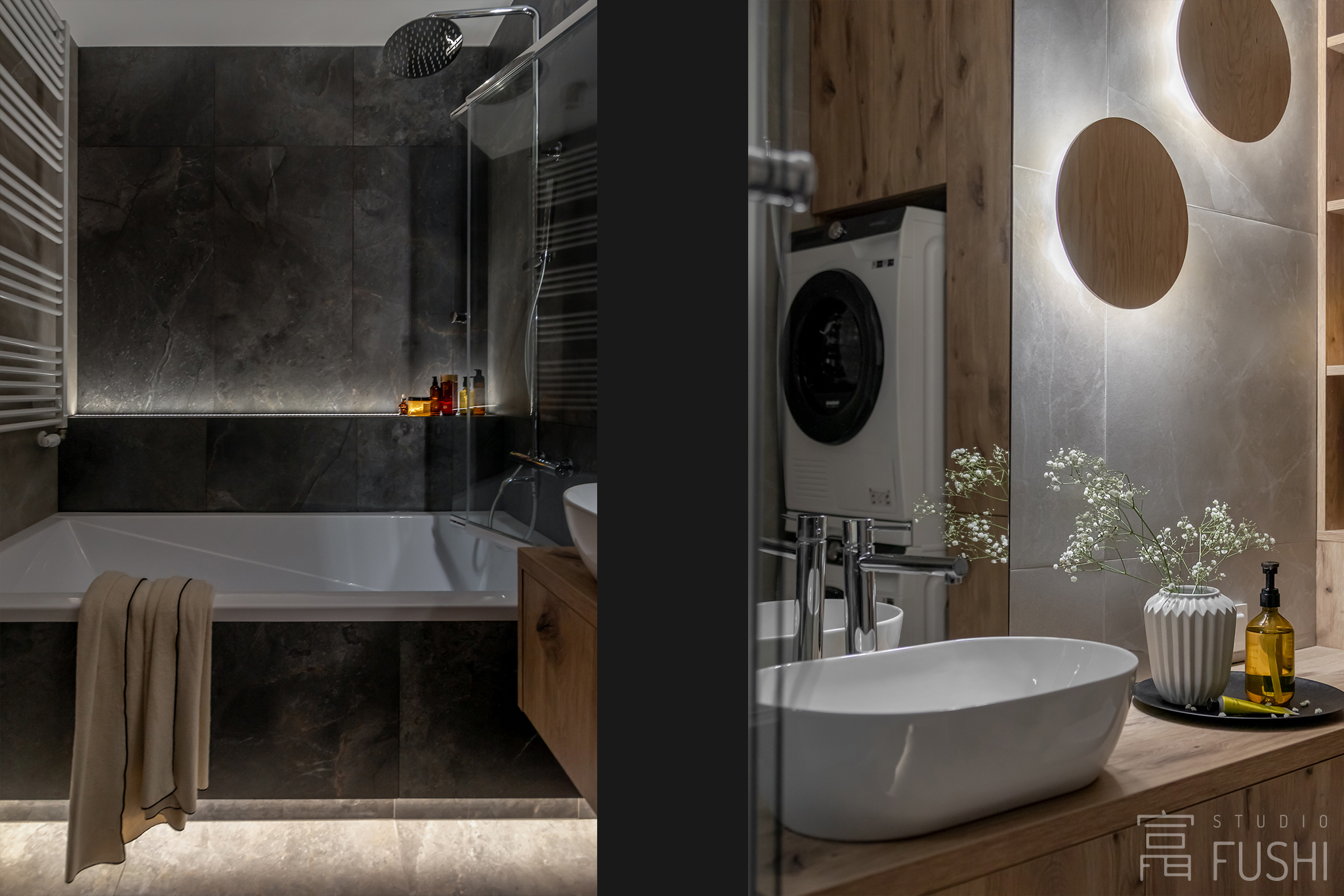 Część prywatna utrzymana jest w tej samej, spokojnej estetyce. Ograniczona liczba materiałów, uważnie zaprojektowane detale oraz wyważone proporcje budują wnętrze neutralne i ponadczasowe, zaplanowane z myślą o długofalowym użytkowaniu, a nie chwilowych trendach.
