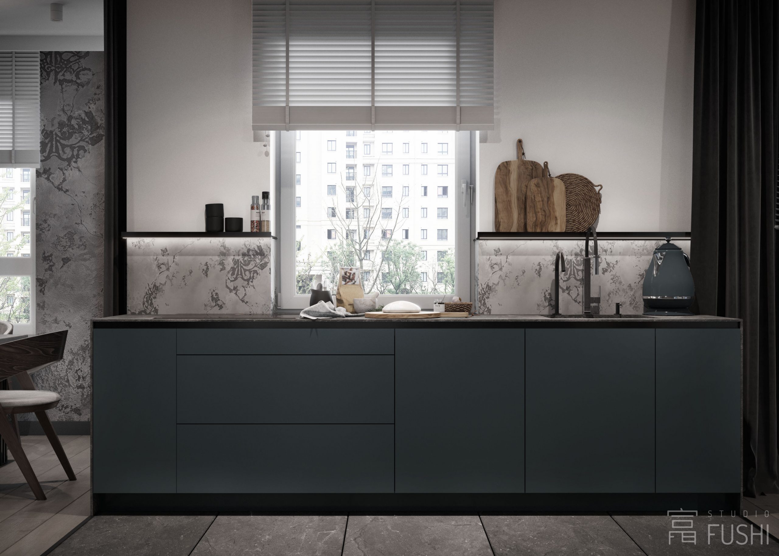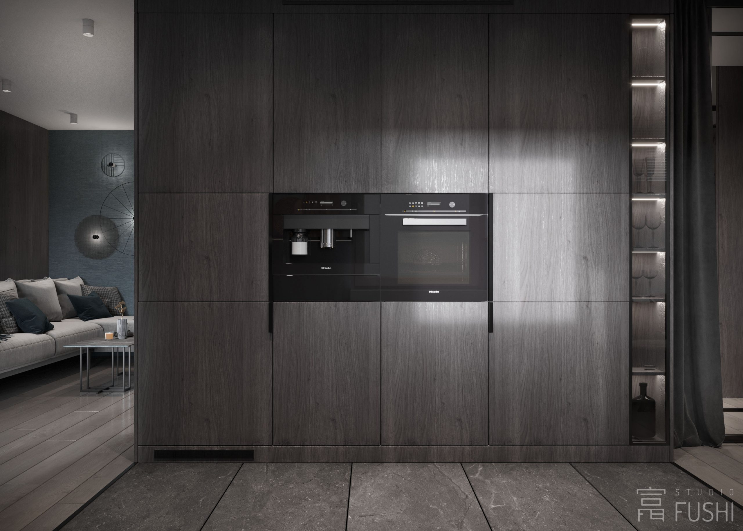 Wnętrze opiera się na stonowanej palecie barw, naturalnych wykończeniach i prostych rozwiązaniach stolarskich, które porządkują przestrzeń i nadają jej architektoniczną czytelność. Strefa dzienna została zaplanowana jako otwarta, ale wyraźnie zdefiniowana — kuchnia i salon tworzą jedną całość, zachowując funkcjonalną równowagę i spójność estetyczną.